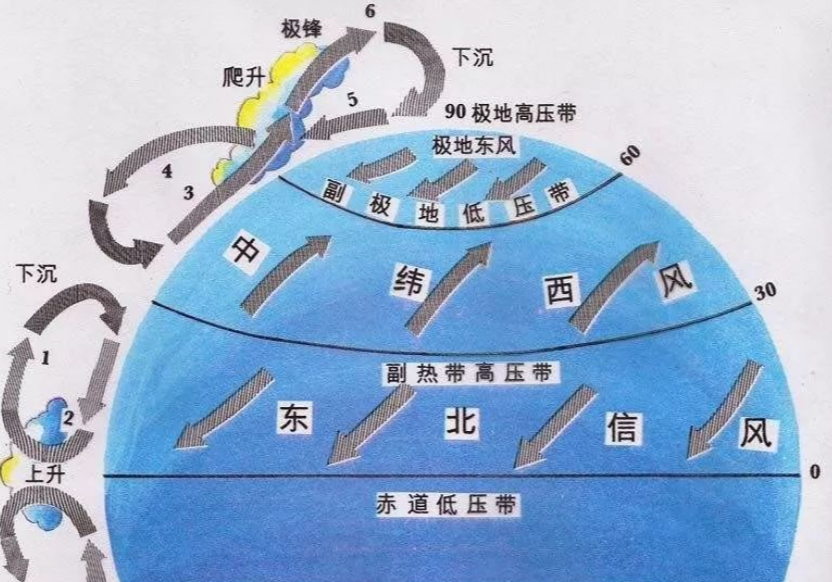 由于地球表面海陆分布形态而导致其所接收的太阳辐射加热效果不同,从而形成了全球风带分布。在北半球近地面,北纬30度附近下沉气流呈东北向流向赤道的风流背景为东北信风带,该信风带稳定但风速不大,约 3-4级;在北纬30度附近下沉并流向极地的气流,呈偏西方向,且风速较大,称为盛行西风带;而从极地高压流出的空气,吹偏东风,形成极地东风带。北半球东北信风带、中纬度西风带和极地东风带是我国风气候的主要背景(图3.1)。