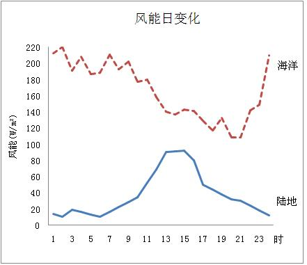 我国各地的平均风速和风能资源都具有明显的日变化特征。一天中,上午6~8时风速最小,然后逐渐增大,午后15~17时达到最大值;而后逐渐减小,夜间变化缓慢,次日凌晨达到最小。孤立的山顶风速的昼夜变化与山麓平原相反,最小值出现在午后,最大值出现在夜间。