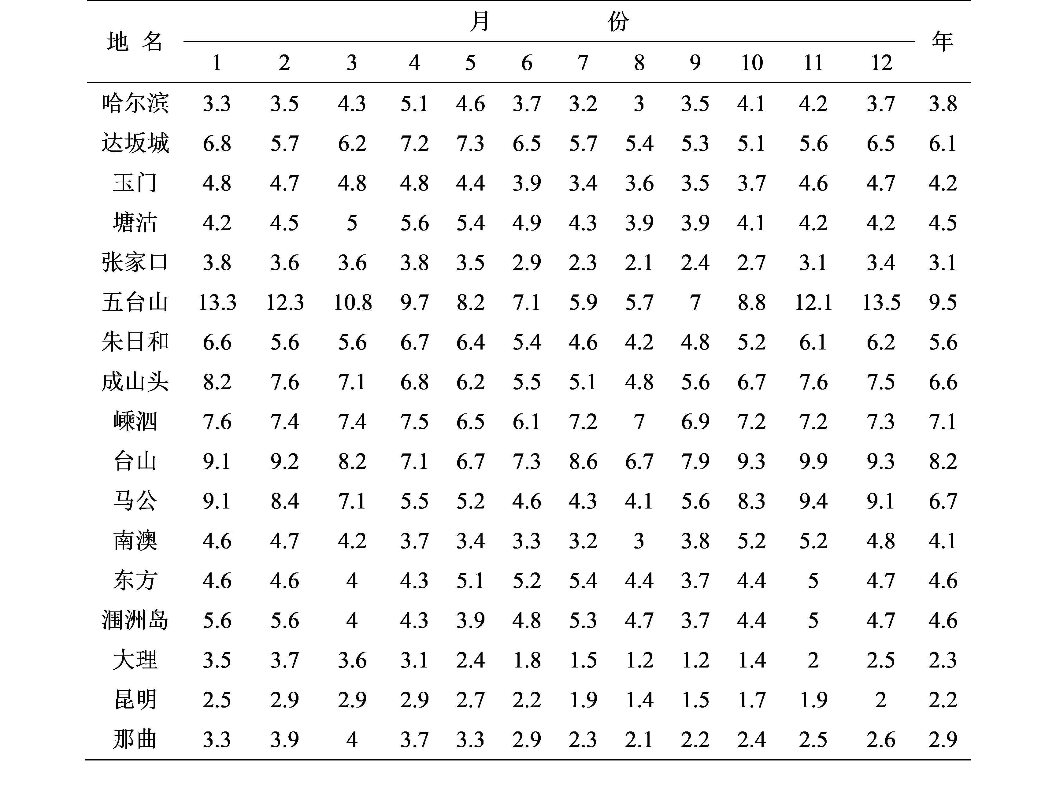 冬季,我国在蒙古高压控制之下,每当冷空气南下,就会形成较大的风速;春季冷暖气流交换频范,所以春季是一年中风速最大的季节。我国的华北和西北地区春季风速最大,冬季次之;例如塘沽、朱日和、达坂城、玉门等地(表3.1)。东北地区春季风速最大,秋季次之、夏季最小;如哈尔滨等地春季4月份出现最大值,8月份出现最小值。我国东南沿海、华南地区,一年中秋季风速最大,冬季次之;如平潭、南澳、台山、马公等地。总体上,年平均风速大的地方,各月之间的风速差异较大,年平均风速小的地方各月之间差异也比较小。