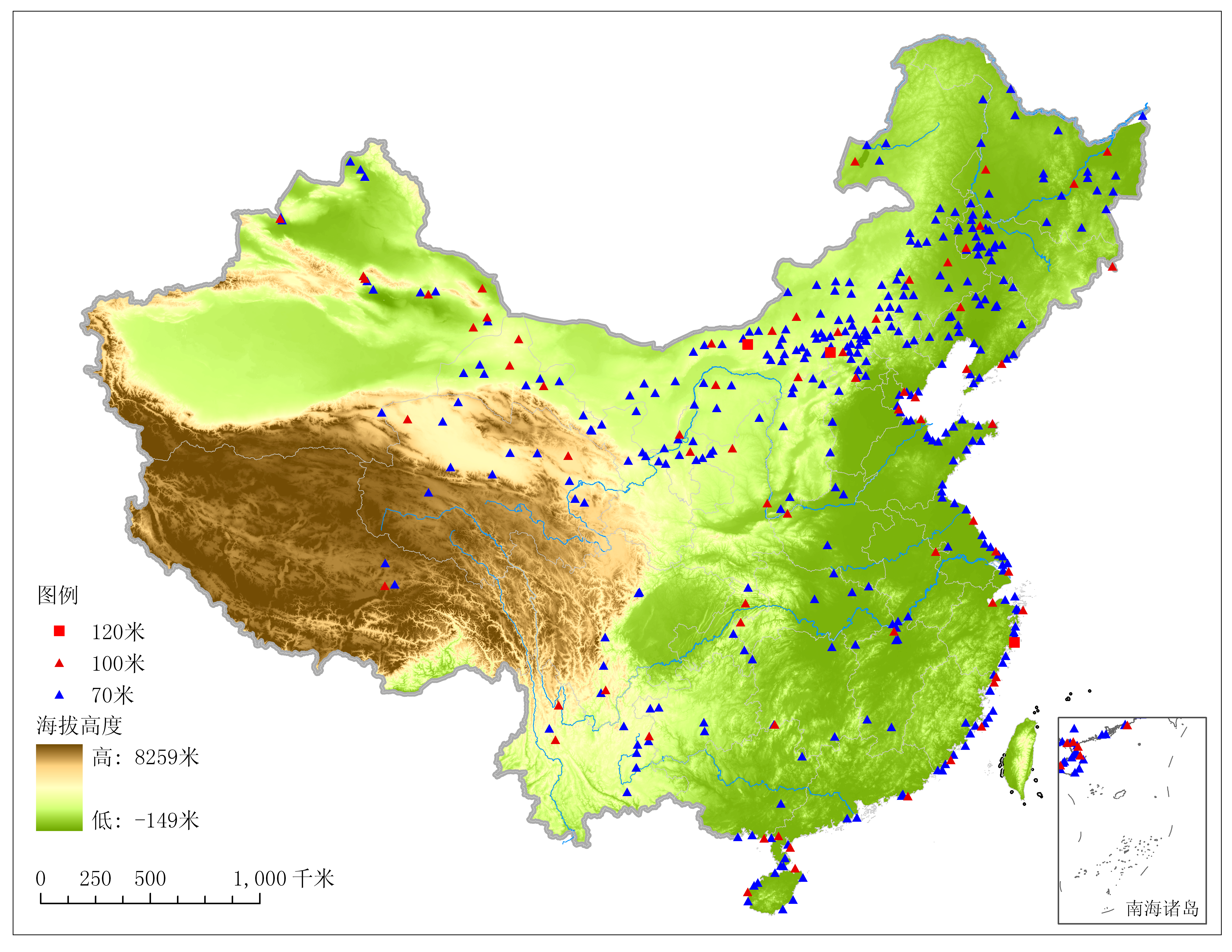 图4.1 全国风能资源专业观测网测风塔分布示意图