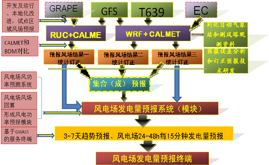 2010年12月24日,中国气象局预报与网络司下发《关于编制2011年现代气候业务建设试点工作实施方案的通知》(气预函〔2010〕174文号),提出2011年现代气候业务建设试点任务,其中包括气候资源类试点任务——基于BJ-RUC的风能预报系统建设和风能预报气象服务试点:建立预测精度较高、符合风电预报要求、可持续发展的风能预报业务体系。以内蒙古为试点建立国家级-省级风电预报指导业务流程和省级风电场风电预报示范业务流程。在甘肃、辽宁等省选择风电场开展试点服务,逐步形成风电功率预报业务服务能力。