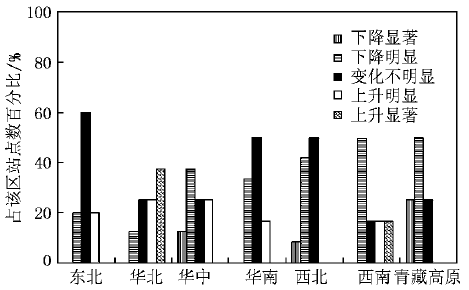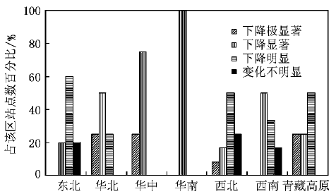 1961—1990年全国49 个站点各区域年散射辐射变化趋势占该区域站点数百分比由图9.8和表9.5可见。在东北区,变化不明显的站点最多,占60.0%,其次为下降明显和上升明显,分别均占20.0%。在华北区,上升显著的站点最多,占37.5%,其次为变化不明显和上升明显,分别均占25.0% ,其中,上升趋势的站点占50.0% 以上。在华中区,下降明显的站点占37.5% ,其次变化不明显和上升明显的分别均占25.0%。在华南区,变化不明显的站点最多,占50.0%,其次下降明显和上升明显的分别占33.3% 和16.7%。在西北区,变化不明显的站点居多,占50.0%,其次为下降明显,占41.7%。在西南区,下降明显的站点最多,占50.0%,其次变化不明显、上升明显和上升显著的分别均为16.7%。在青藏高原,下降明显的站点最多,占50.0% ,其次下降显著和变化不明显的分别均占25.0%。
