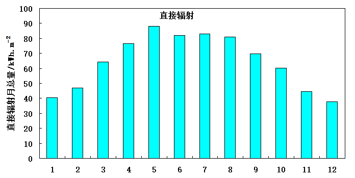 直接辐射的年变化与总辐射的年变化基本一致,一年内1、12月份最小,东南沿海个别地区和西藏出现在2月。最大值出现出现的时间差异较大,我国西部地区随纬度的增高而落后,东部地区随维度的增高而提前。