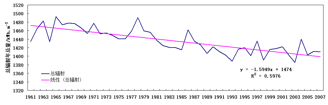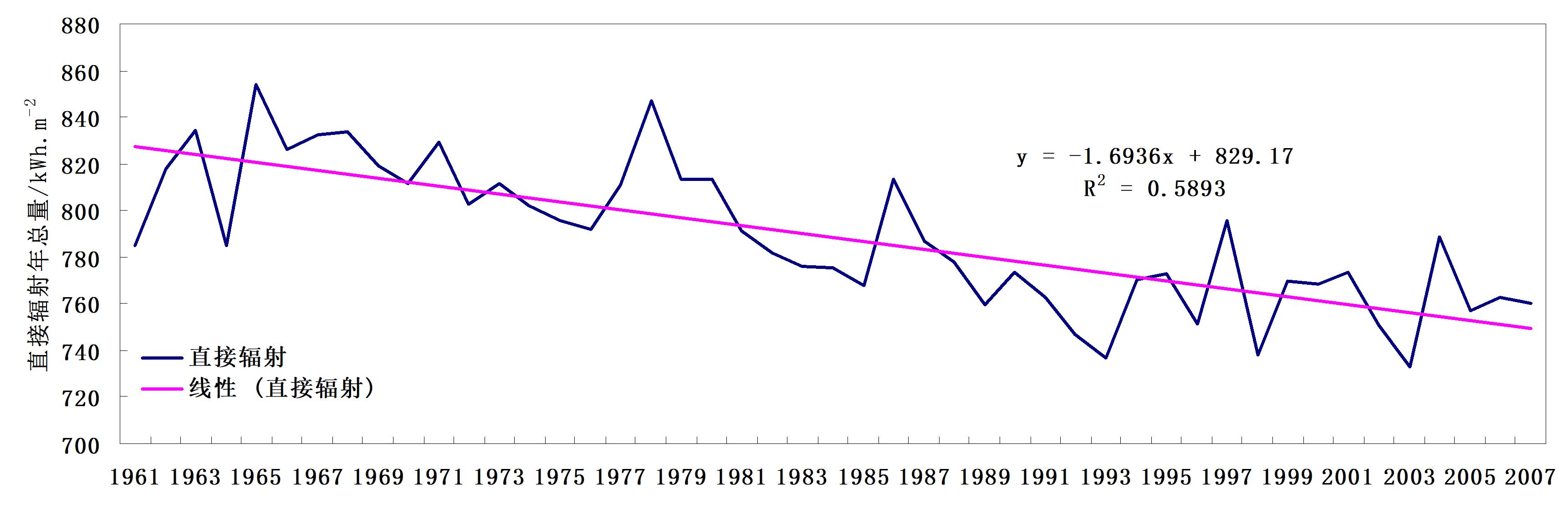 另有学者使用1961—1990年的49个站的直接辐射和散射辐射资料分析了其年际变化趋势,这些观测站点分布在全国各个地理气候区域,在行政区域分布上,东北5个、华北8个、华中(把浙江、上海和江西归在此区)8个、华南(把福建归在此区)6个、西南6个、西北12 个、青藏高原4个。在气候带分布上,中温带11个,暖温带14个、北亚热带8个、中亚热带5个、南亚热带7个、青藏高原4个。从城市看,主要省级大城市26 个、其他城市23 个。