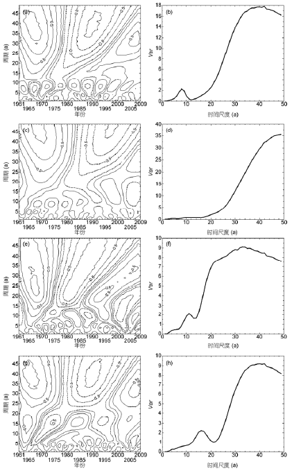从各区域中挑选一些站点作为图例说明, 如图9.3所示。 例如: 从图9.3乌鲁木齐站地面年太阳总辐射的小波方差来看, 其年际周期为6-9a, 年代际周期为35a以上。 但由于资料年代不够长, 35a 以上的长周期变化还需今后更长的资料进一步分析验证。 从图9.3小波变换图来看, 该站的地面年太阳总辐射现正处于偏多期的后期, 今后将进入偏少期。