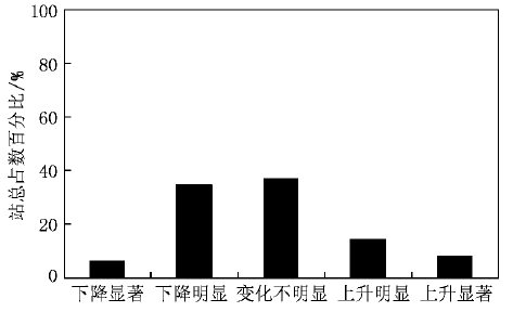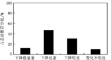 1961—1990年太阳直接辐射变化趋势如图9.5所示,绝大部分站点为下降趋势,其中下降显著的站点居多,占总站数的46.9% ,其次为下降明显和下降极显著,分别占30.6% 和12.2% ,而变化不明显的仅占10.2%。