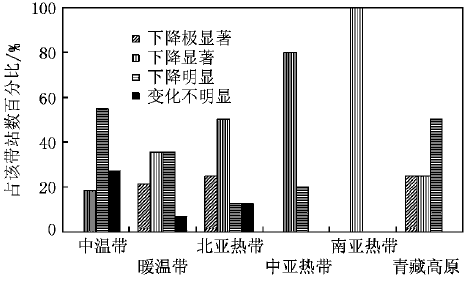 从1961—1990年49个站的观测资料分析来看,直接辐射的变化趋势具有明显的地理分布特征。由图9.6和表9.2可见,1961—1990年各气候带太阳直接辐射变化趋势有明显差别。在中温带,下降的站点占该带总站数的72.7%,其中下降明显和下降显著的分别占54. 5%和18.2%,变化不明显的占27.3%。在暖温带,下降的站点占92.8%,其中下降明显、下降显著和下降极显著的依次占35.7%,35.7% 和21.4%,变化不明显的占7.1%。在北亚热带,下降的站点占87. 5%,其中下降显著的最多,占50.0%,下降极显著的占25.0%,而变化不明显的占12.5%。在中亚热带,下降显著的站点最多,占80. 0%,其次下降明显的占20.0%。在南亚热带,所有站点均为下降显著。在青藏高原,下降明显的站点最多,占50.0%,其次为下降显著和下降极显著,分别均占25.0%。总之,各个气候带虽大都为下降,但下降的幅度有明显差异,其中,中亚热带、南亚热带和青藏高原所有站点均为下降,而中温带有27.3% 的站点为变化不明显。