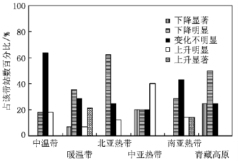 1961—1990年全国49个站点的太阳散射辐射变化趋势具有明显的地理分布特征. 由图9.9和表9.4可见,1961—1990年各气候带散射辐射变化趋势有明显差别。在中温带,变化不明显的站点最多,占该带总站数的63.6%,其次为下降明显和上升明显,分别均占18. 2%。在暖温带,下降的站点占42.8%,其中下降明显和下降显著分别占35. 7% 和7. 1% ;上升的站点占28. 5% ,其中上升显著和上升明显分别占21.4% 和7.1%;变化不明显的占28.6%。在北亚热带,下降明显的站点占62.5%,变化不明显的占25.0% ,上升明显的占12.5%。在中亚热带,上升明显的站点居多,占40.0%,其次下降明显和下降显著的分别均占20.0% ,而变化不明显的占20.0%。在南亚热带,变化不明显的站点最多,占42.9%,降明显的占28. 6%,而上升明显和上升显著的分别均占14.3%。在青藏高原,下降的站点占75.0% ,其中下降明显和下降显著的分别占50.0% 和25.0%,变化不明显的占25.0%。总之,各热量带大部分为下降趋势,但也有上升的站点。