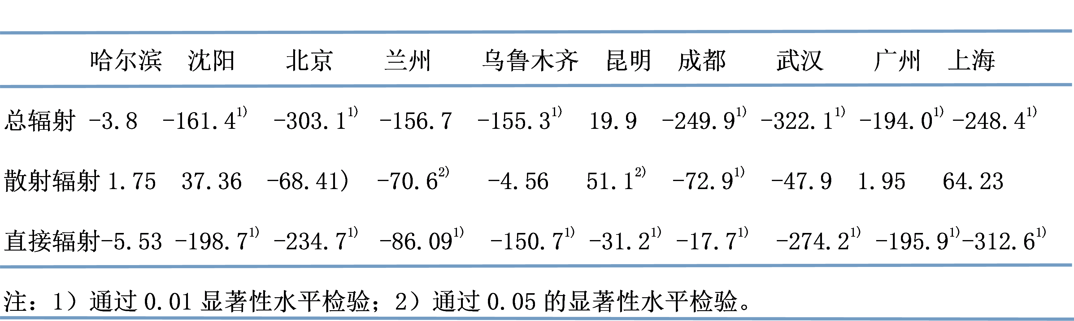 表9.1 各城市太阳散射辐射和直接辐射的线性趋势系数