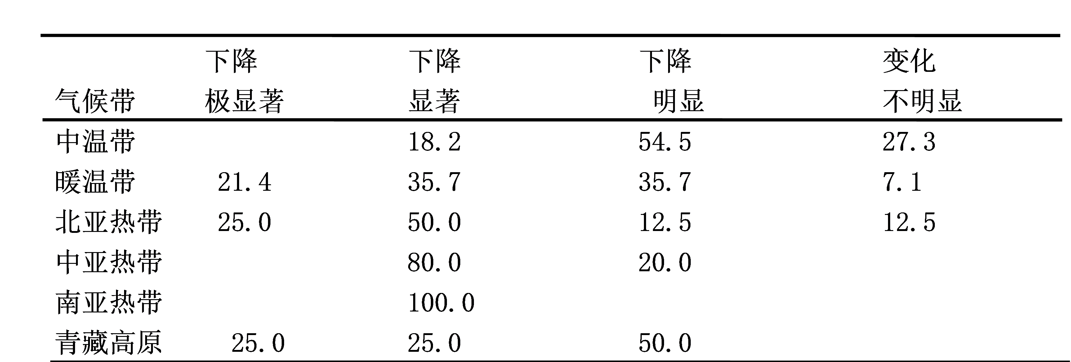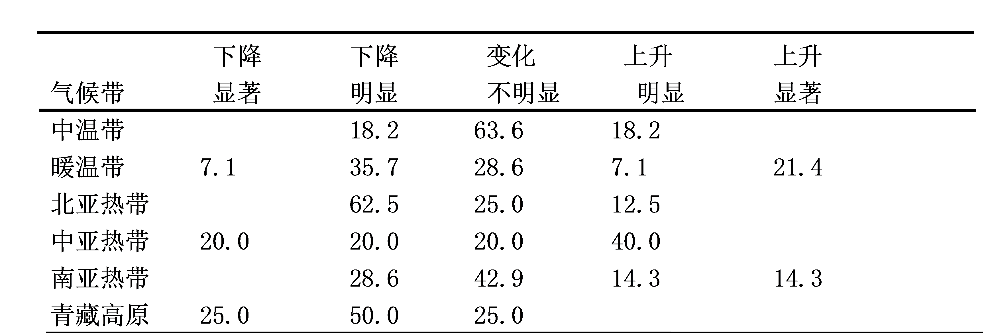 表9.2 1961—1990年不同气候带年直接辐射变化趋势分类(占该带总站数百分比单位:%)