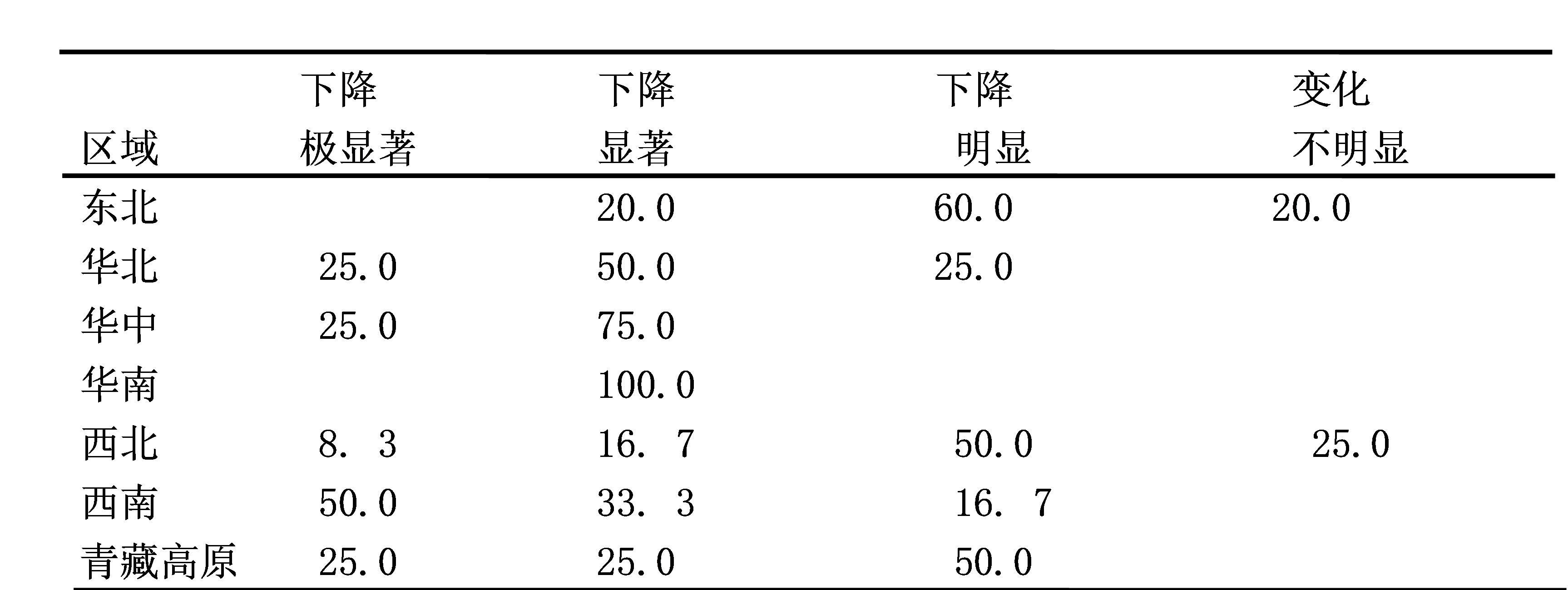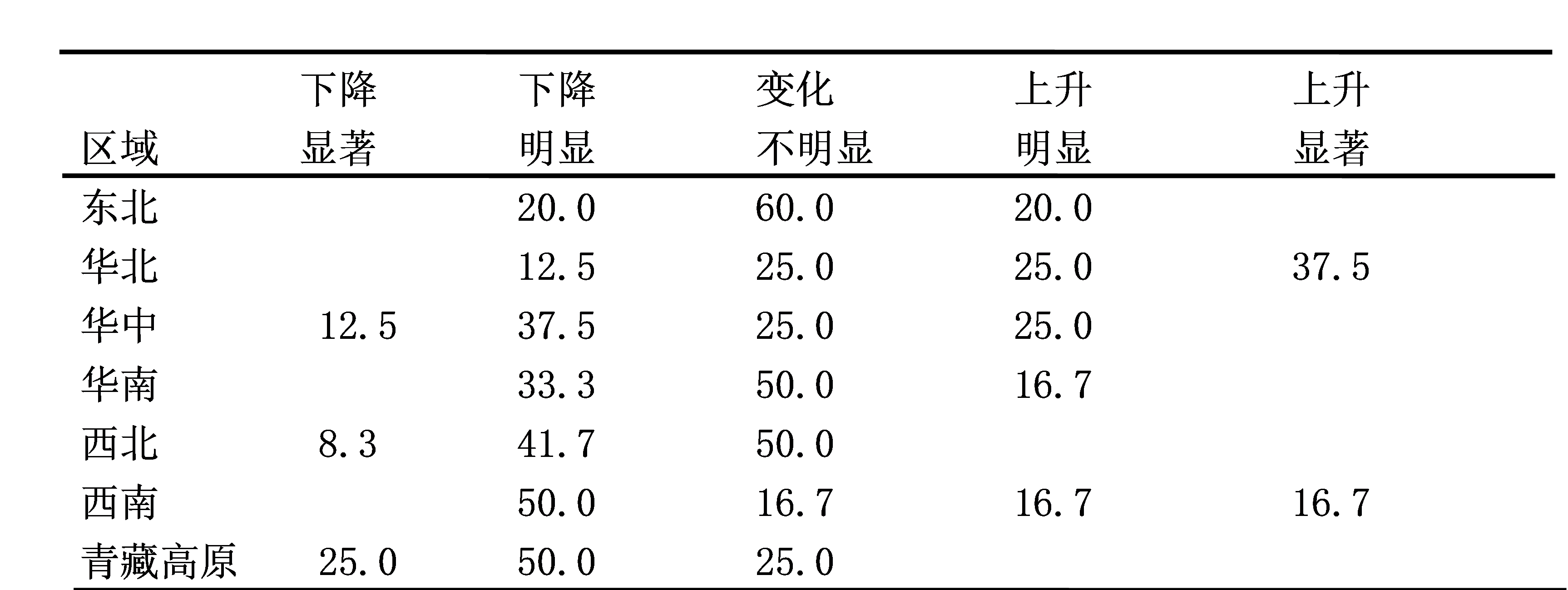 表9.3 1961—1990年各区域年直接辐射变化趋势分类(占该带总站数百分比单位:%)