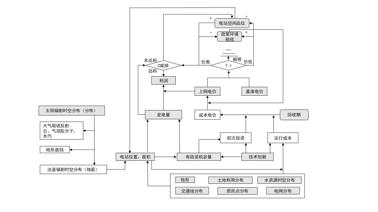 大型太阳能电站可以是 MW 级和高压电网并联的荒漠光伏电站、MW 级和低压网并联的城镇光伏电站、低成本太阳能聚光热发电,并辅助以大规模电站的热电循环,太阳能综合利用建筑。图12.3描述了太阳能热电站选址的基本原理 ,反映了发电技术、成本、发电规模、投资量及回收期、和政策之间的相互依存关系。其输入项包括:太阳辐射时空分布(天文潜力), 全国地形场点坡度与遮挡)、土地利用(用地成本)、水资源(太阳能发电介质: 水、空气、熔盐)、交通(距离导致人员及设备维护成本)、电网(输电成本),技术创新(技术成本)、基准电价(比较优势)、政策税收(环境容量、京都议定书、可再生能源法、税赋减免、其他优惠政策)。其中作为圆角方框的电站空间品位和政策环境税收是主要的可调控项。矿石品位指单位体积或单位重量矿石中有用组分或有用矿物的含量,类似地,电站空间品位指法直辐射强大从而使得太阳能热利用效率较高。