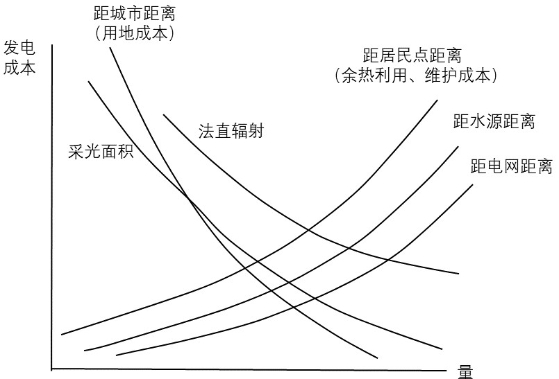 图12.4列举了其中的空间因素与发电成本的定性关系,具体参数需要用地理信息系统、遥感、测站、模型和技术经济分析比较确切地进行定量估计, 最终建立太阳能热电站选址决策支持系统(Location Choice System of Solar Heat Power Plant,LCS2SHPP) ; 然后,用 GIS多指标约束和 GA 及蚂蚁算法输入 SCS2SHPP搜寻一座有经济竞争力的太阳能热发电站的潜在靶区位置,其寻址条件包括如下方面:年太阳法直辐射大于 X ( kw•h/m )并且保证率大于P(%), 荒漠地区,坡度小于1%的面积大于 A( km²), 距离主要交通线Y(km )左右,距离电网E(km) 左右,距离水源W( km )左右、H ( km )以内居民多于 Z万人,居民年人均收入在 C(元)以上(买得起电 ) 。