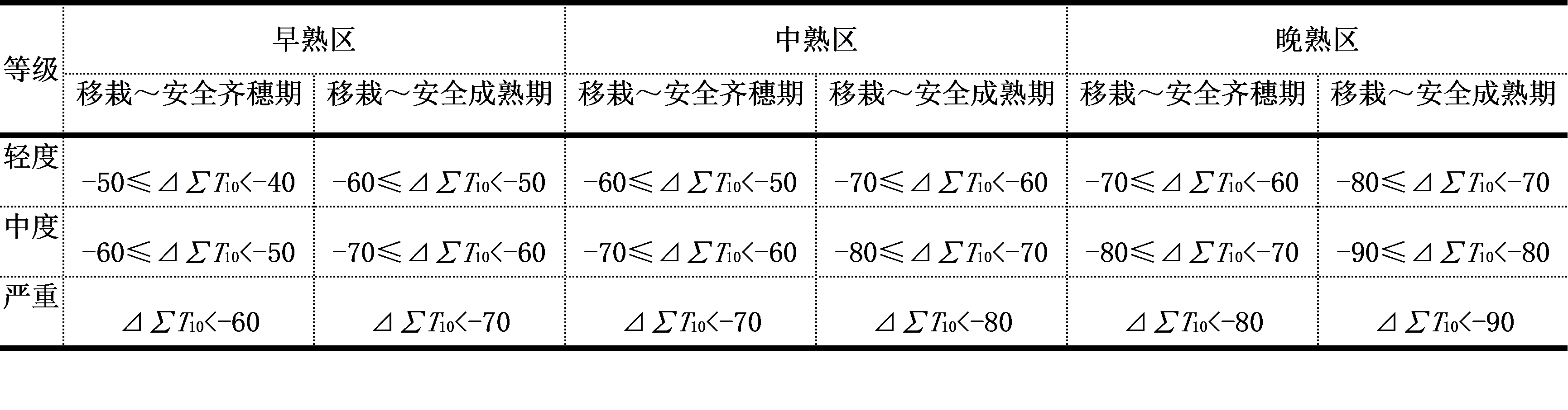 轻度冷害:当年水稻齐穗期比安全齐穗期延迟5d左右,约减产5~10%;