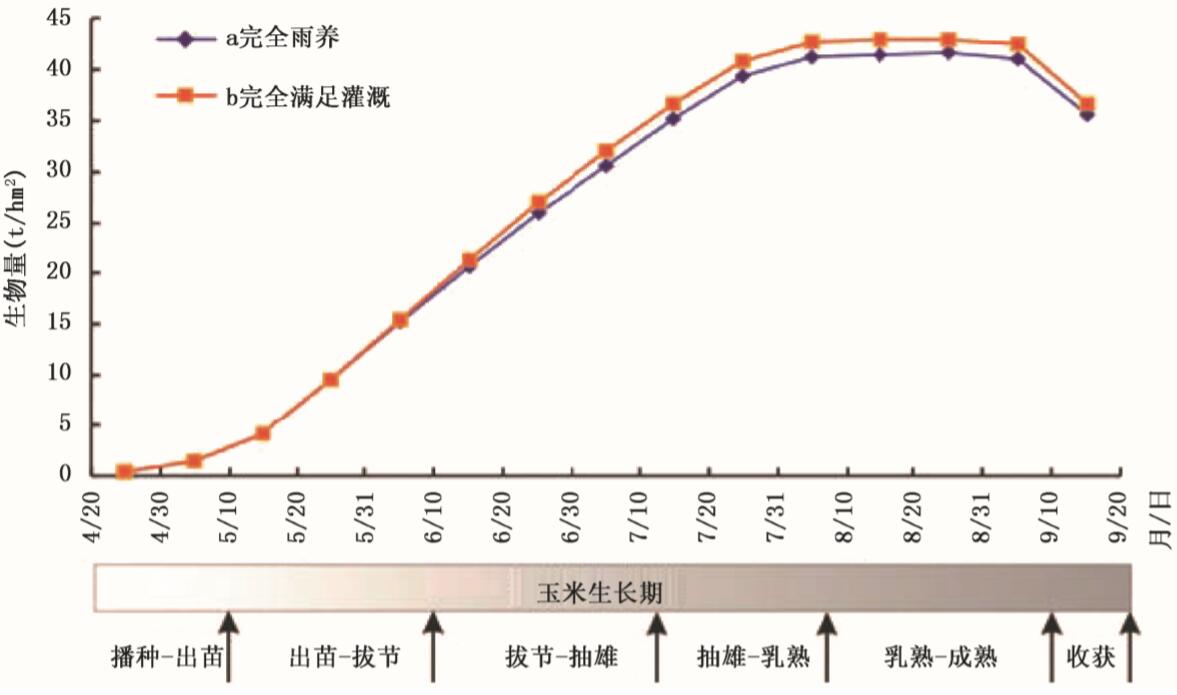 随着生育期的变化,生物量在玉米各器官之间进行分配以及不断积累的过程。基于黄淮海夏播玉米区内每个8 km网格的每年不同生育期,在EPIC模型里,通过设定2个情景:S1情景(完全满足养分与完全满足水分)和S2情景(完全满足养分与完全雨养),分别进行1966-2005年各自生育阶段的逐日生物量(Biomass)值模拟。比较40年因旱生物量损失的风险变化,图6.2中a,b两条曲线表示玉米干物质累积的动态变化,而a,b两条曲线之间间距表示因旱生物量损失值。