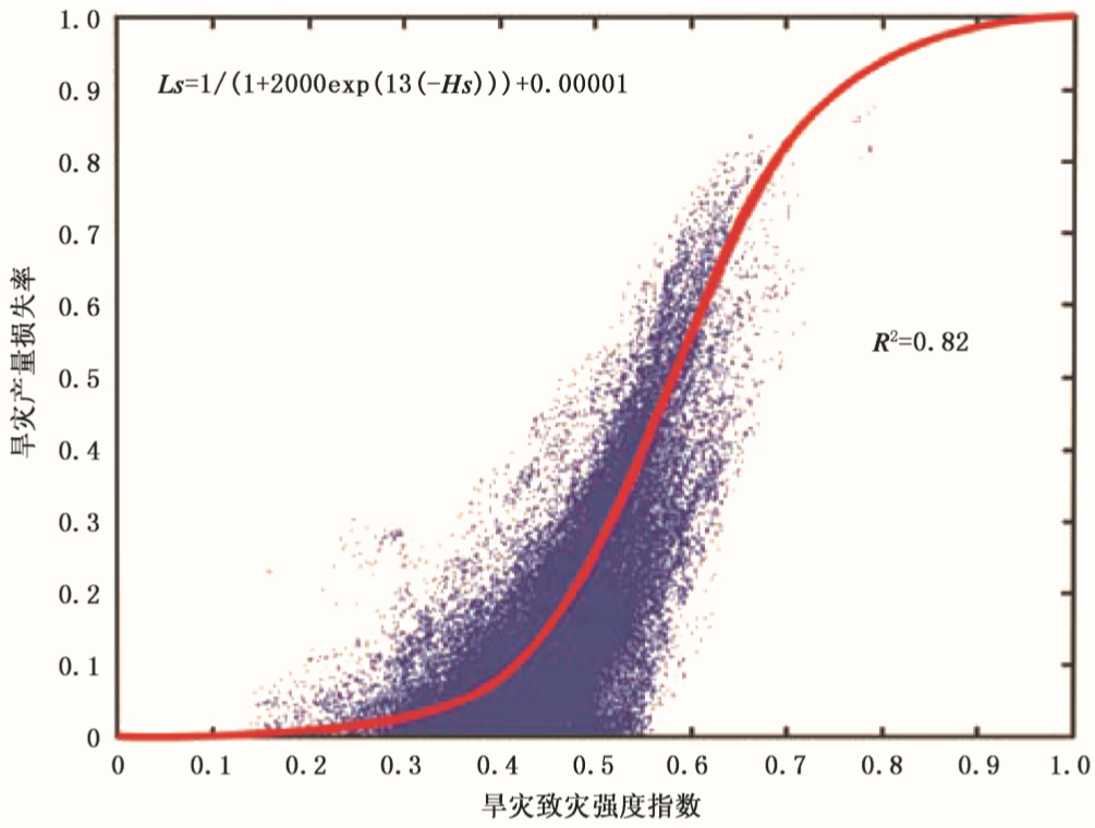 利用调试好的EPIC模型进行模拟。先控制养分和通气性胁迫,然后设定:完全满足养分与完全满足水分(Y1情景)和完全满足养分与雨养即不灌溉(Y2情景),分别进行模拟产量,利用Y1减去Y2的产量,认为是达到了剔除温度胁迫对作物生长的影响,只受水分胁迫影响的玉米产量损失值。计算每个站点在相应整个生长季内的旱灾致灾指数和2种灌溉情景设定下的玉米产量损失值。最终通过MATLAB软件非线性统计模型进行多次拟合,回归出脆弱性曲线图和相应的函数方程,确定夏玉米旱灾的自然脆弱性曲线(图6.4)。