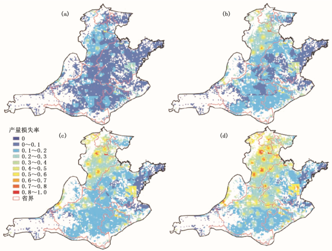 图6.5 黄淮海夏玉米旱灾(a)2年、(b)5年、(c)10年、(d)20年一遇风险水平产量损失分布