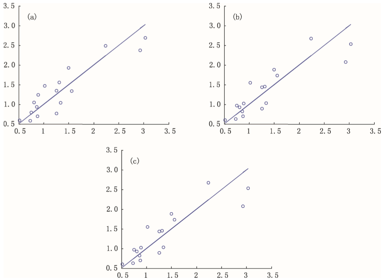 图7.1 不同时间尺度(a)6h、(b)12h、(c)过程性降水≥12h降水雾渡河水位增量模拟值与实际值散点分布图