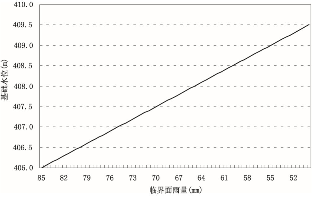 同样选取2011年6月13日20时—14日08时雾渡河流域的这次暴雨过程为例,6月13日20时雾渡河基础水位为406.17m,根据临界面雨量计算公式计算可得: