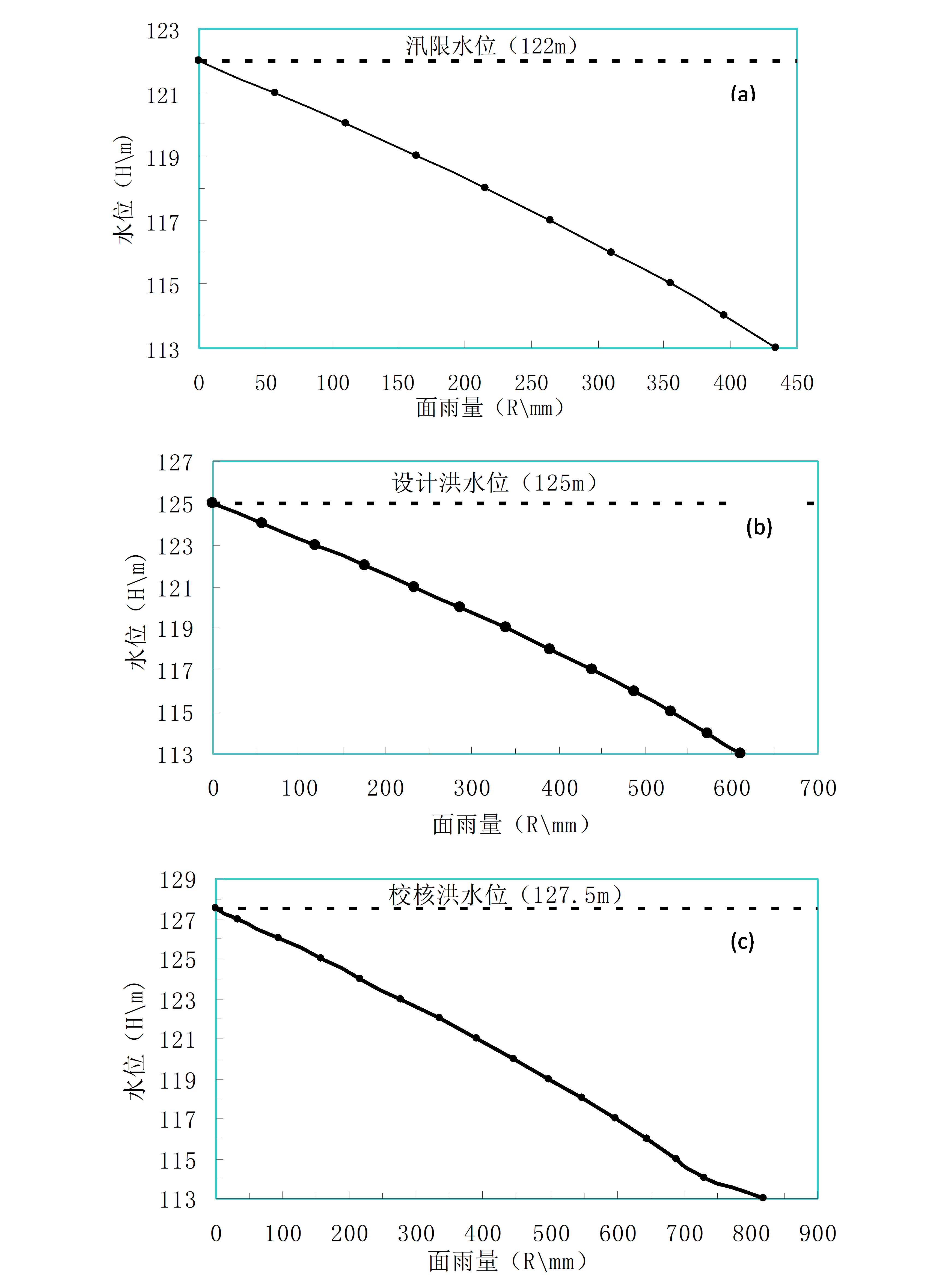 图7.4 漳河水库不同洪水水位((a)汛限、 (b)设计、(c)校核)水位雨量统计关系曲线