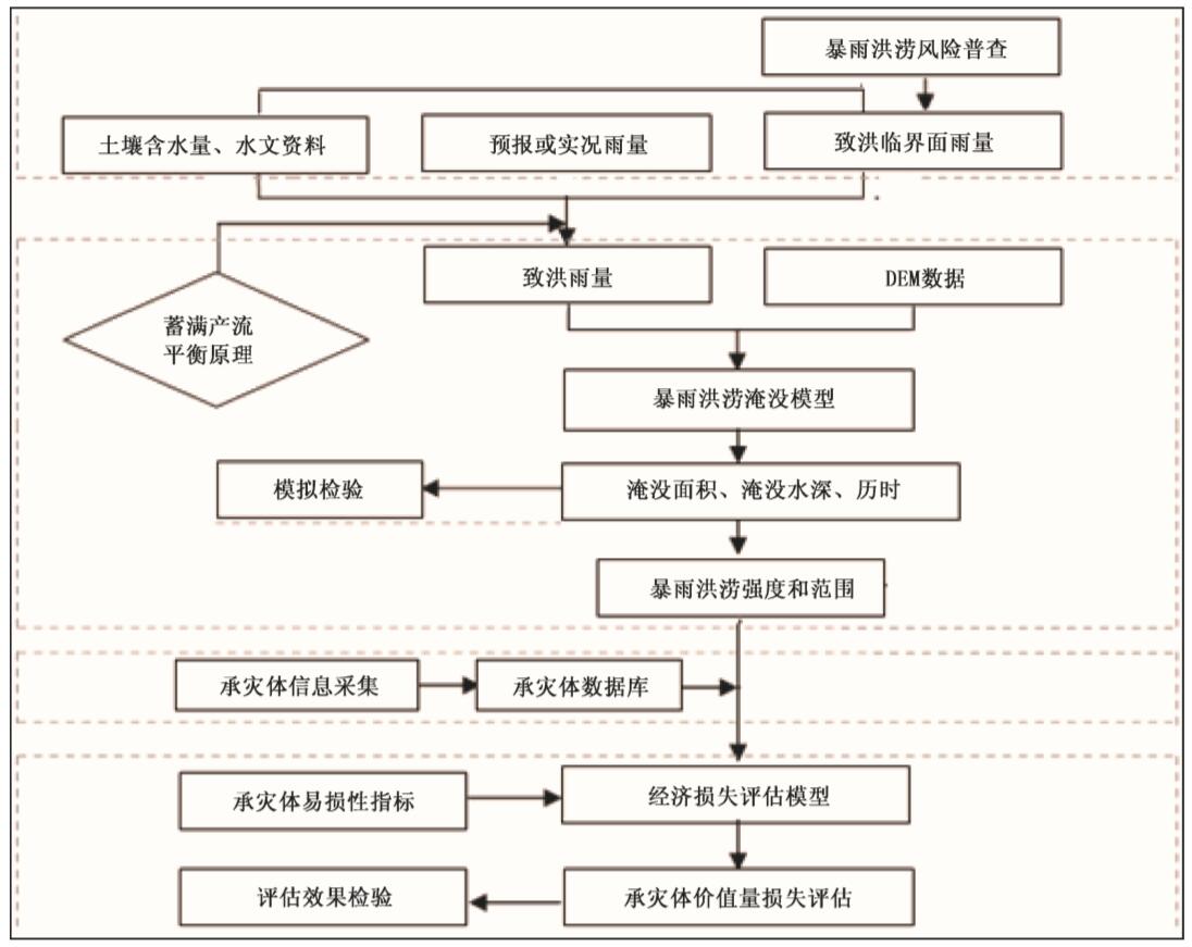 基于若干典型灾害案例(洪灾出现时水位)或防洪设施标准(警戒、保证、分洪水位等),采用水文模型及流量和水位关系,进行反演分析产生洪灾的临界气象条件,应用该条件作为判断是否进行风险评估后续分析的阈值。