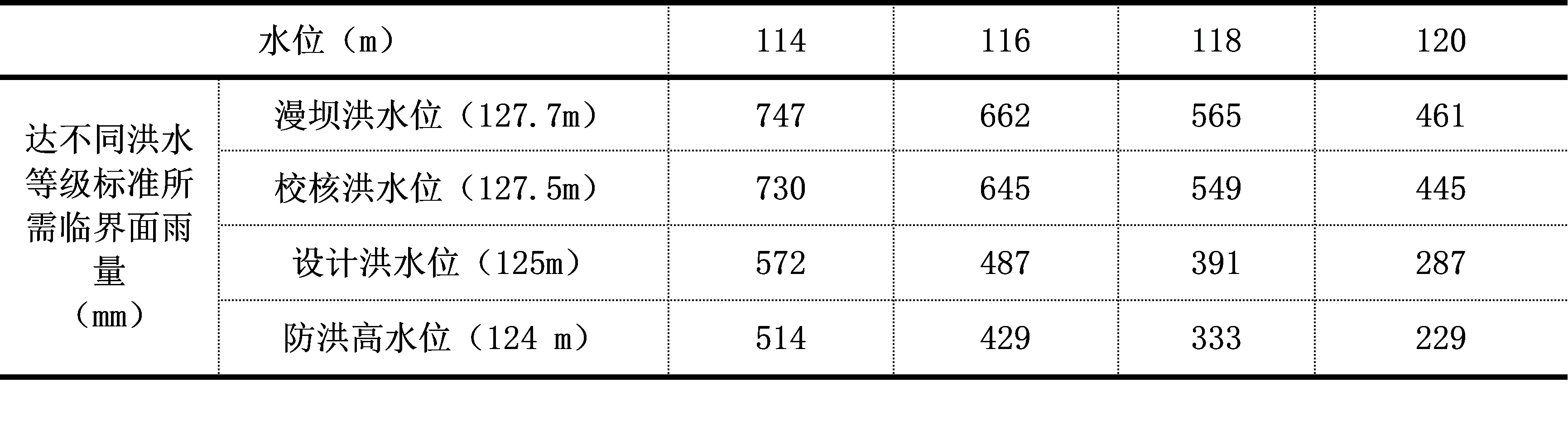 表7.8 不同基准水位达到防洪高水位(124m)对应面雨量