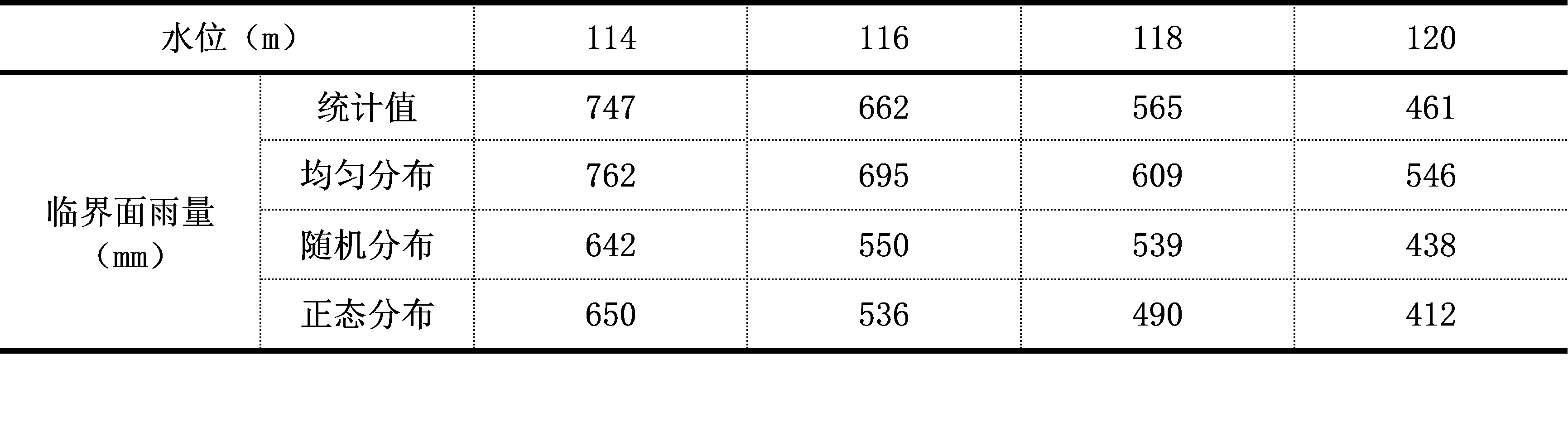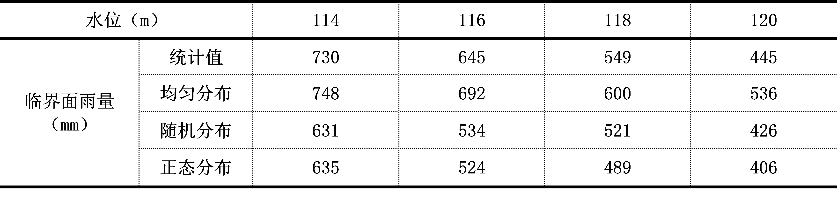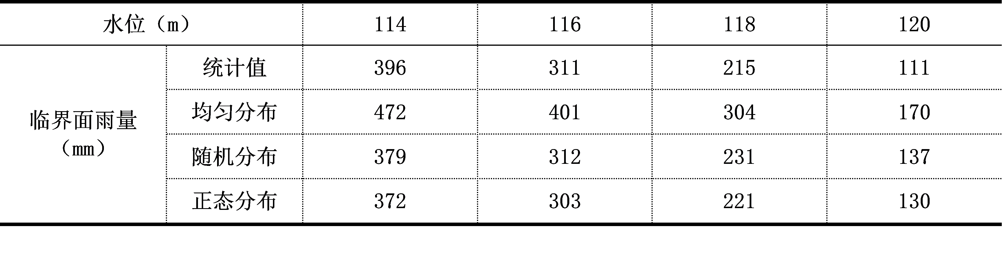 模拟研究发现,中小河流及流域临界面雨量不仅与水位有关,而且雨量时空分布不同,其模拟计算结果也不同,雨量均匀分布,临界雨量唯一,雨量正态分布差异较小,雨量随机分布差异较大;其次模拟计算的时效不同,汇流时间不同,其模拟计算的结果也不同。