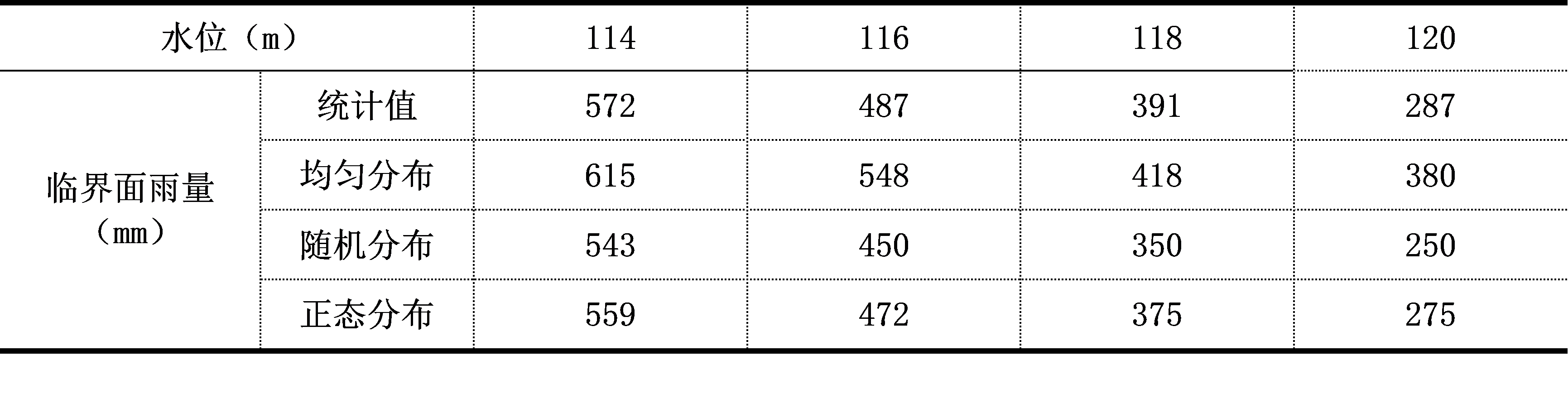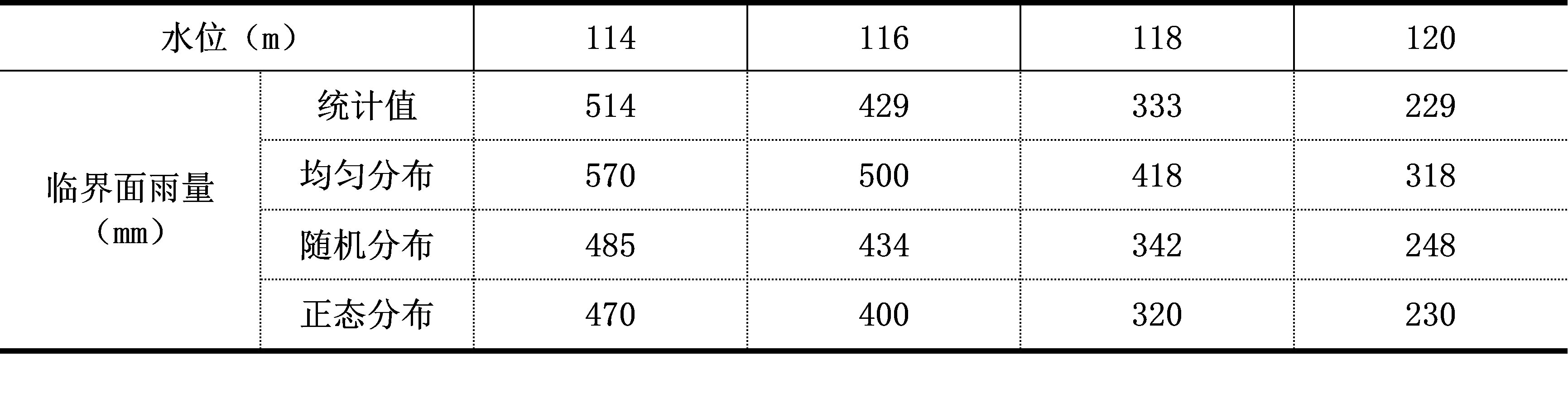 表7.12为漳河流域不同洪水等级临界面雨量。试验流域模拟计算表明,雨量呈平均分布条件下达到漫坝洪水位、校核洪水位、设计洪水位及防洪高水位、汛限水位所需的临界面雨量最大,同时高于统计值;而在漫坝洪水位、校核洪水位、设计洪水位下,正态分布临界雨量均小于统计值,同时,在漫坝洪水位、校核洪水位,除114m水位以外,正态分布临界雨量均小于随机分布。在试验流域,从天气学角度分析,一般雨量呈现均匀分布代表稳定性降水,由于降水过程均匀,产流方式一般以蓄满产流为主,故临界雨量相对较大;而正态分布一般代表着强降水类型,小时雨强大,可能导致产流方式出现超渗产流,故临界雨量较小。