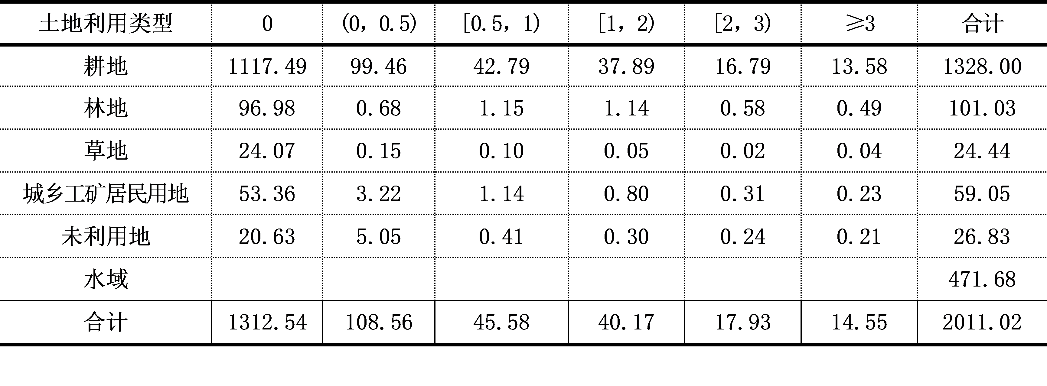 表7.13 各土地利用类型在各水深段的淹没面积(km²)