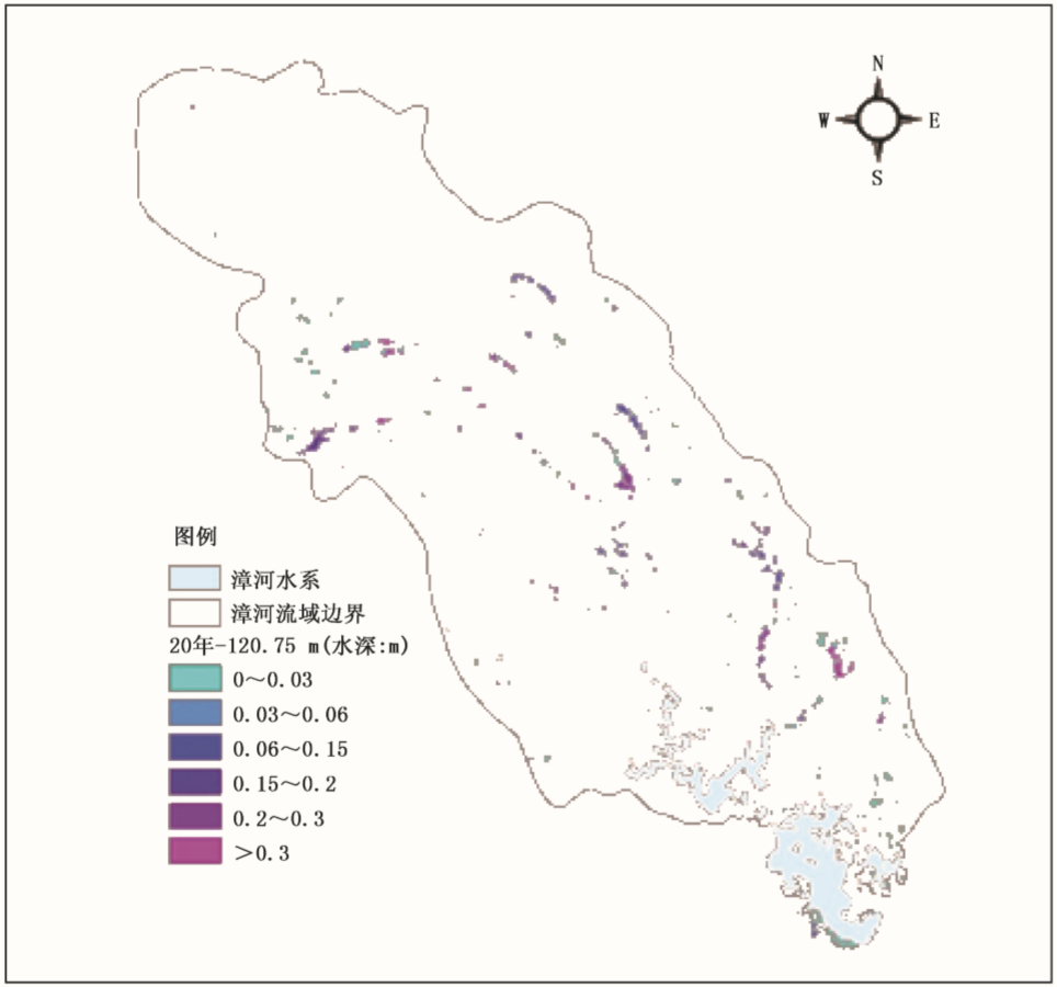 由于不同水位下,临界面雨量不同,运用历史洪涝灾害风险的分析,将120.5~122m之间水位分成三段(120.5~121.0m、121.0~121.5m、121.5~122.0m),分别取其中值代表该段水位,按照20a、50a不同重现期的面雨量计算漳河流域淹没范围和淹没水深。