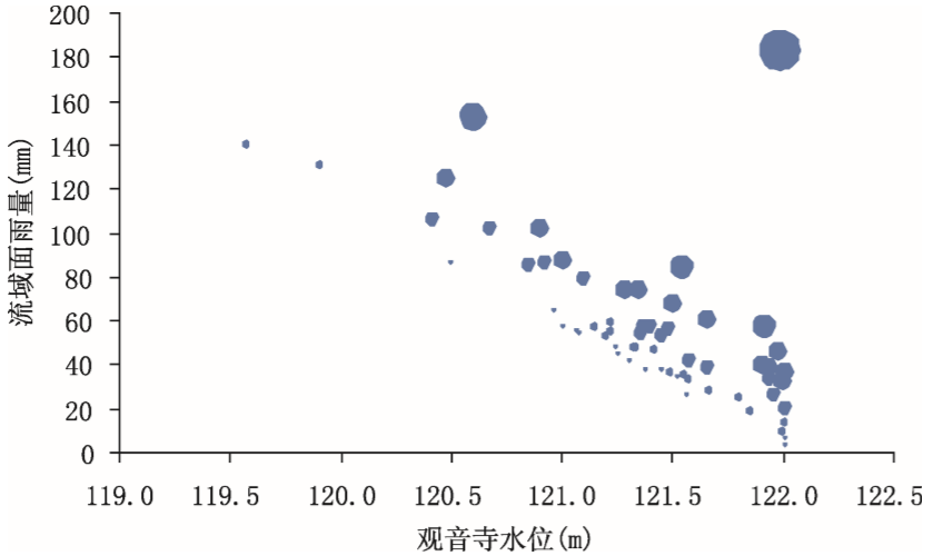 由于面雨量大于致洪临界雨量就可能发生洪涝灾害,运用水位、面雨量资料,挑选过程面雨量(3d)超过临界面雨量的个例,做汽泡图(图7.11),水位为横坐标,面雨量为纵坐标,超过临界雨量的数值为汽泡。汽泡越大,表示超过临界值的雨量越大,即洪涝灾害发生风险越大。结果如图7.11所示,出现洪涝灾害风险的水位段主要在120.5~122m之间,120.5m以下出险的概率很小,而119.5m以下,无出险个例。(如连续几天出现风险,取第一天作为风险事件)。