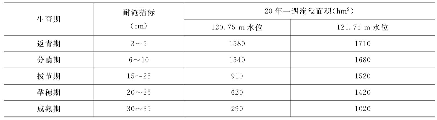 表7.16 不同水位下20年一遇情况下漳河流域水稻不同生育期受淹面积