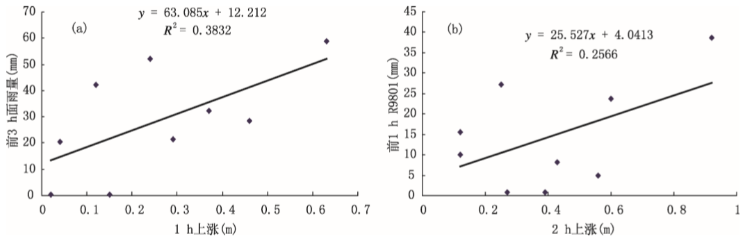 相关分析表明,前3h累计面雨量与未来1h水位涨幅以及R9801站前1h雨量与未来2h水位涨幅具有较高的相关关系(图8.3),也是各种组合中相关最好的二组,相关系数分别为0.62和0.51。分别建立以下回归模型: