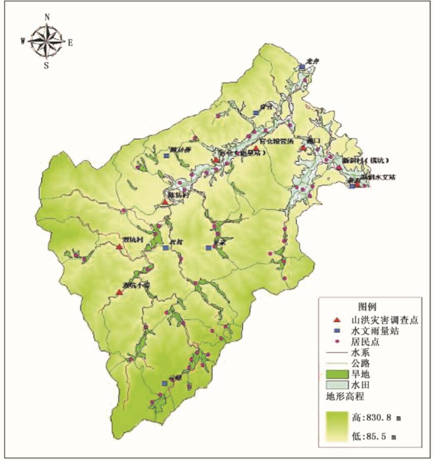曹水流域有村民小组50余个,通过实地考察以及对历史山洪灾害的调查得知,该山洪沟边的水田经常受山洪淹没,并且部分民房也受到山洪淹没。2011年6月20日降水过程造成该流域官仓村10余栋民房受淹,此过程调查得到了较详细的灾情信息,对水文模型、水动力模型的调试有较大的帮助。