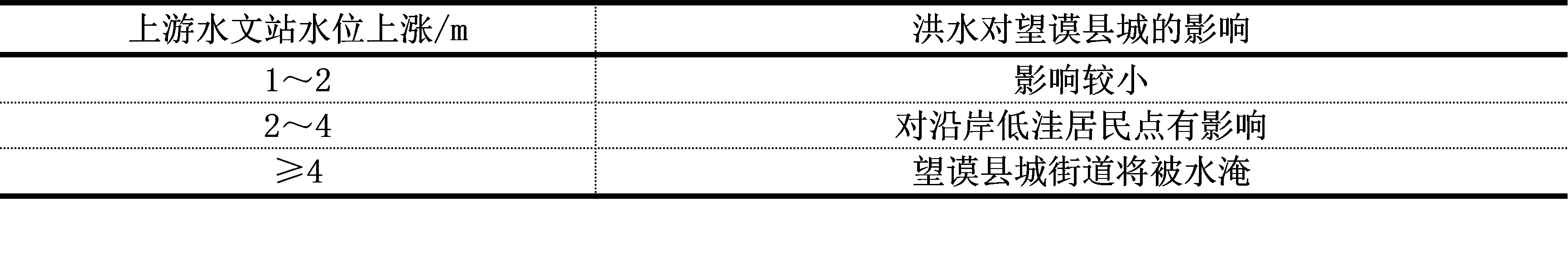 按照山洪等级对应的淹没深度,万安镇自然河岸高于河道4m,取河道为基点,那么各等级淹没水深换算成基于河道的水深就是4m、4.6m、5.2m、5.8m。