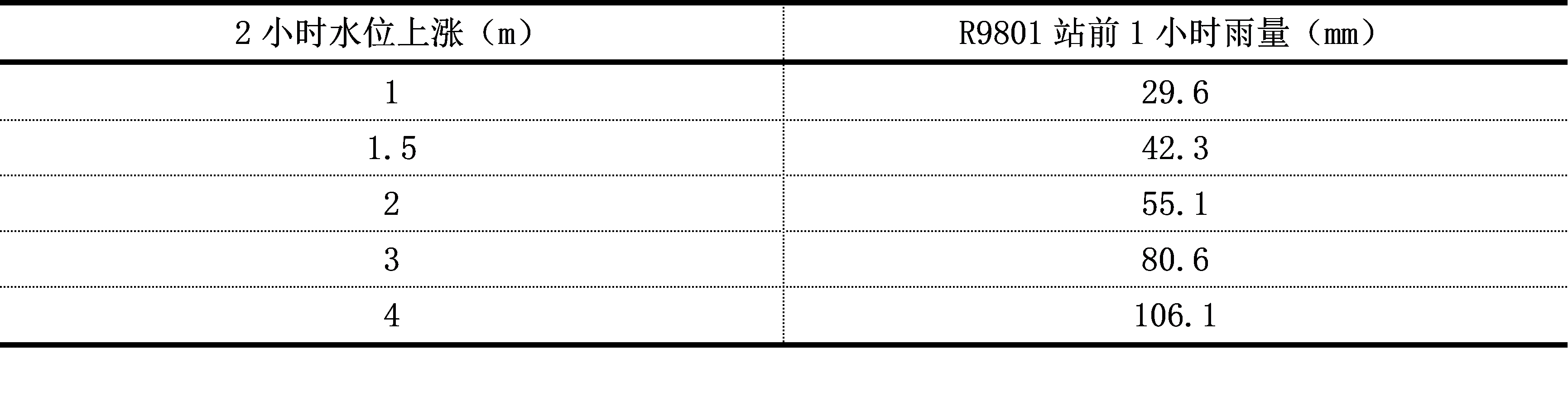 二级山洪:R9801前1h雨量60~100mm,2h水位上涨2~4m;