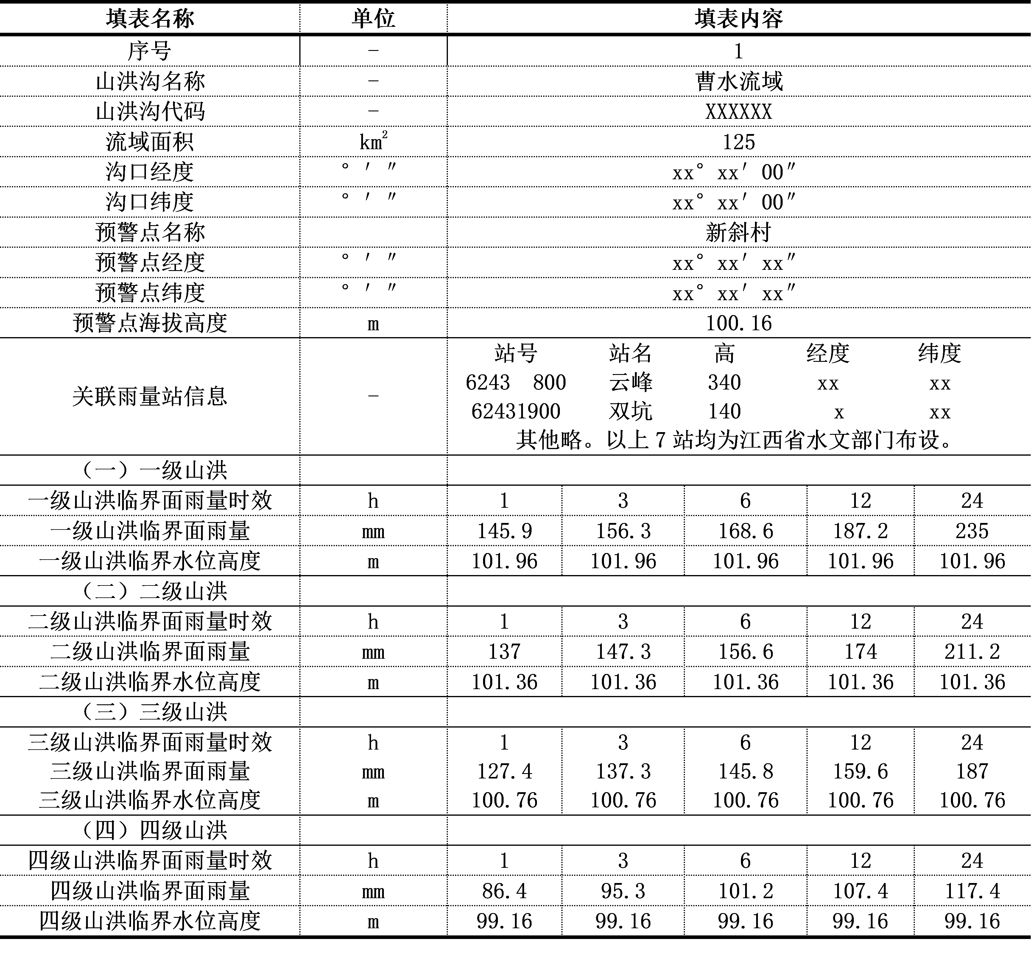 曹水流域新斜水文观测站周围地势开阔,山洪沟附近有大面积农田、居民、房屋,因此将该居民点作为山洪灾害风险预警点。根据现场调查,按照山洪灾害风险等级标准(漫堤、淹没预警点0.6m、1.2m和1.8m),洪水漫出山洪沟的水位为99.16m,作为最低等级四级风险水位,居民点房屋与山洪沟漫沟水位的高程差平均为1.0m,因此,其它三个风险等级对应的水位分别为100.76m、101.36m、101.96m。