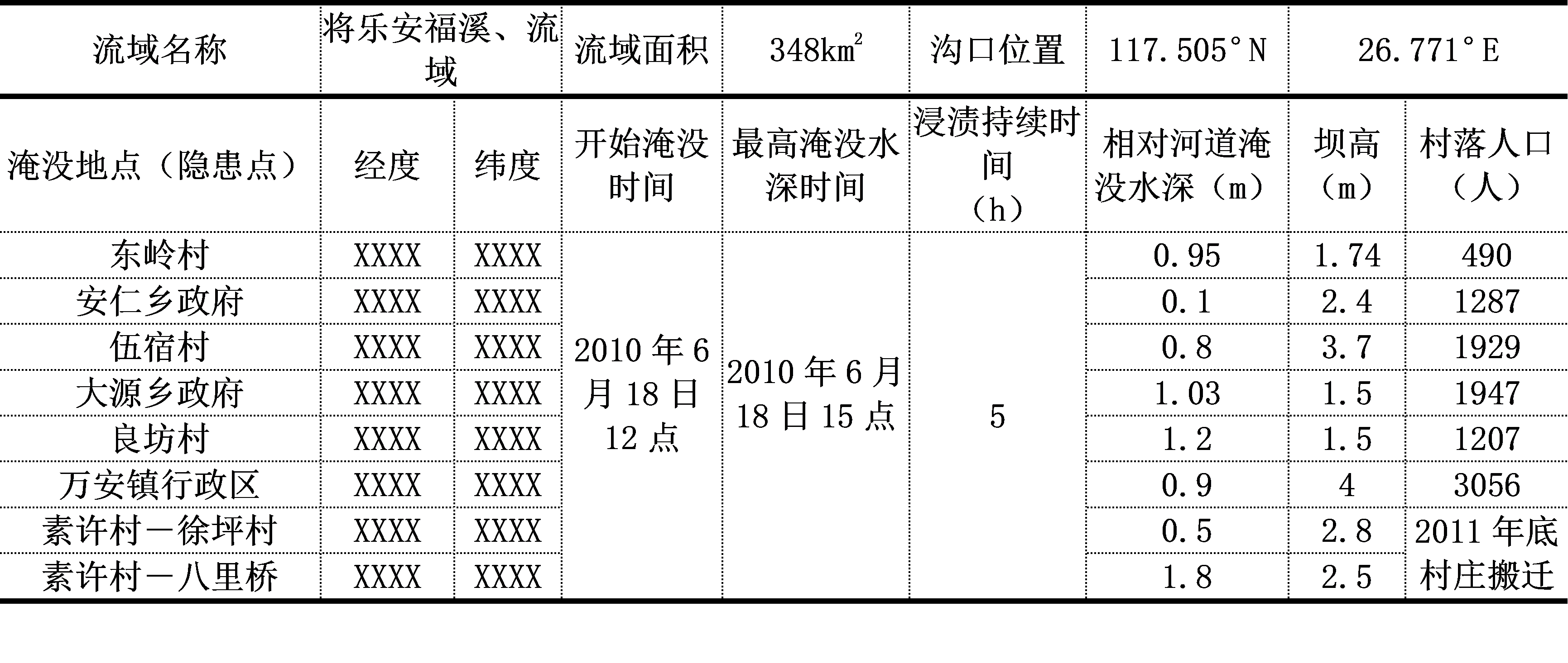 由于将乐县安福口溪缺少水文资料,通过现场实地考察,了解历史洪涝灾害发生发展的情况,对2010年6月18日暴雨过程引发的山洪进行了详细调研,选择隐患点(图8.10),记录洪水淹没情况,着重对淹没范围、淹没深度、河床特征、受灾情况等进行了解和测量,并对当地人口分布做了一些了解与统计。