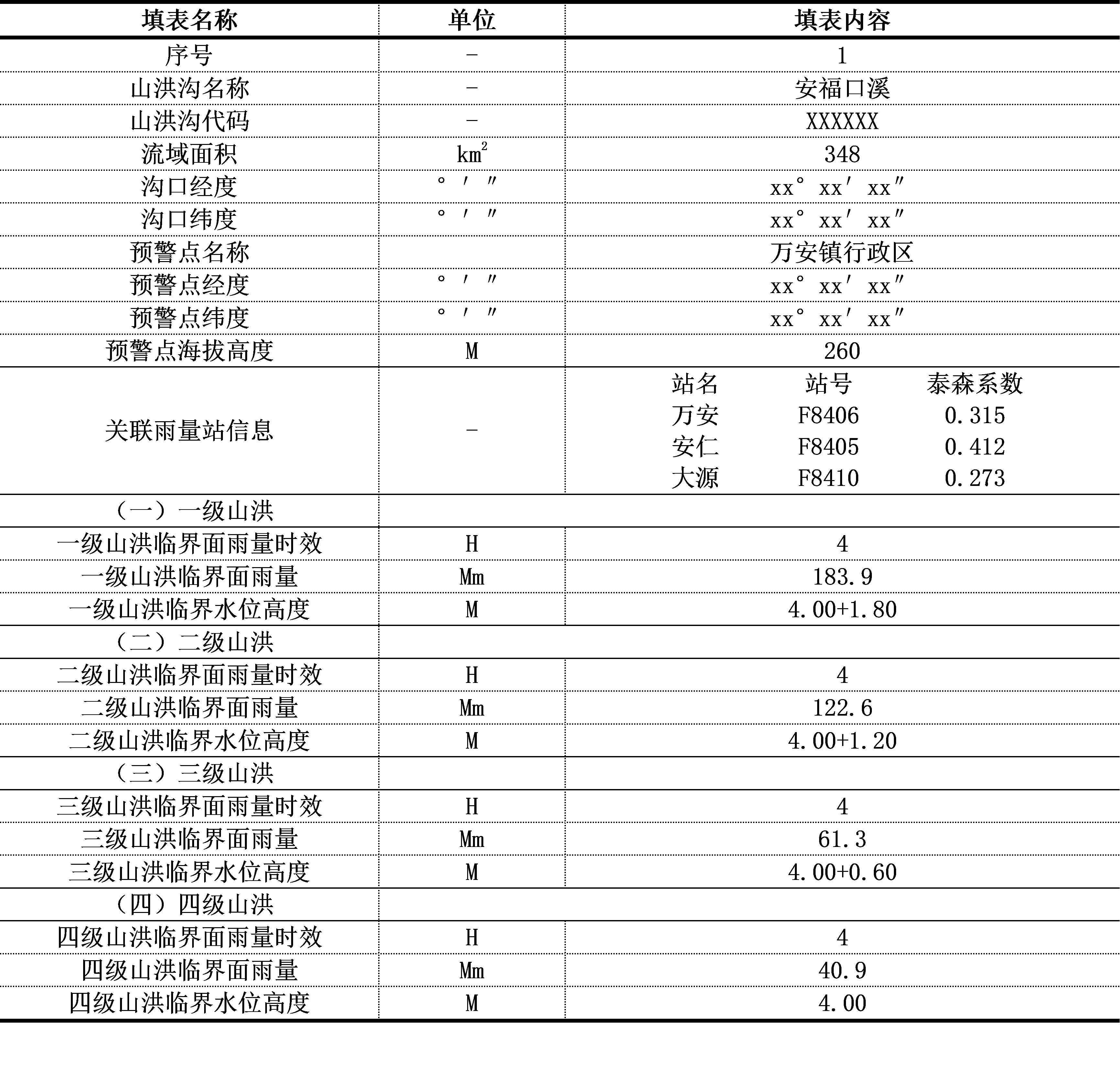 利用3.4式得到四级山洪的临界(面)雨量(表8.9),表中临界水位高度为相对河道的高度。