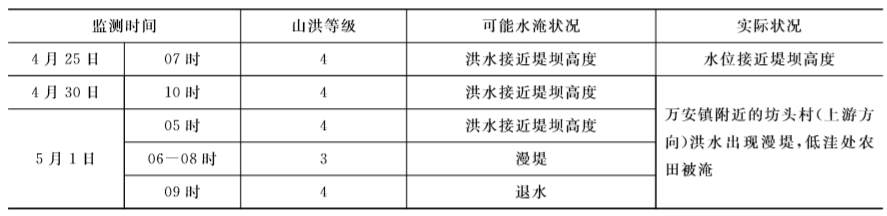 2012年雨季期间,安福口溪监测到2次洪水过程(表8.10),其中5月1日6-8时水位上涨最高,其余洪水都很小,临界面雨量指标和实际情况吻合,检验结果合理。