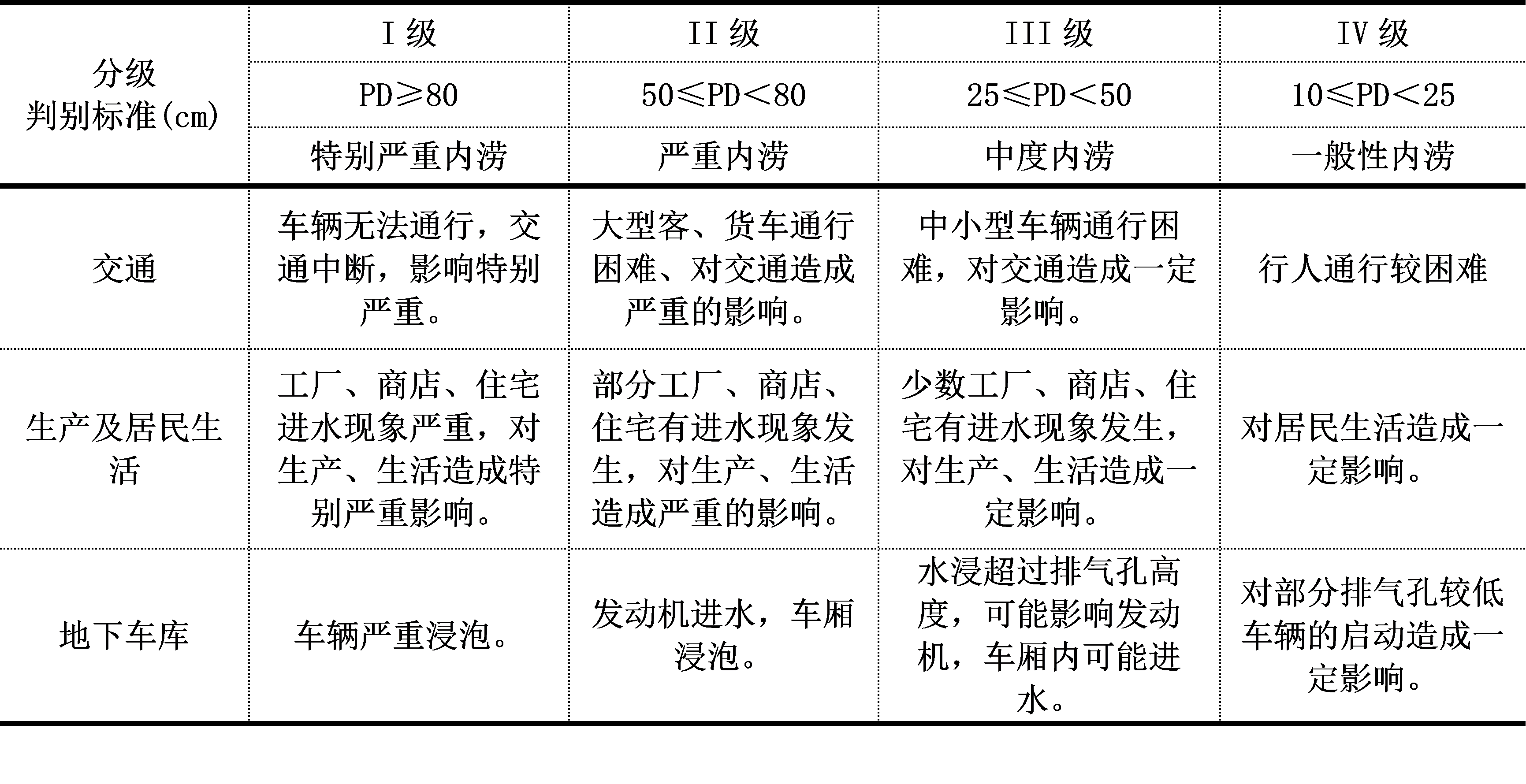 表9.1城市内涝等级标准及对不同承灾体的影响