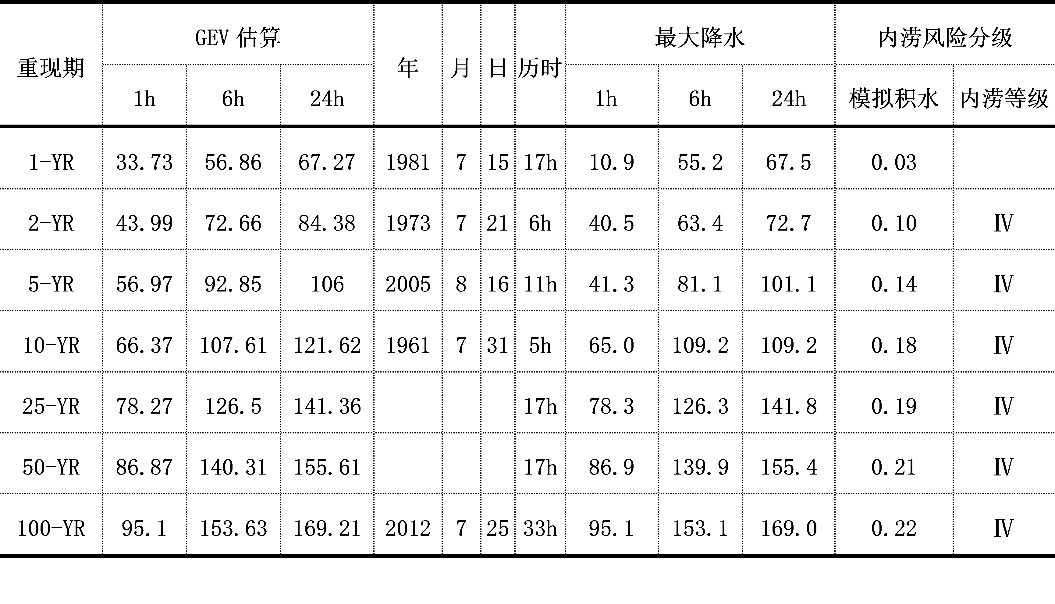 表9.8 港云里社区降水重现期、历时、最大降水量、模拟积水深度及内涝风险等级